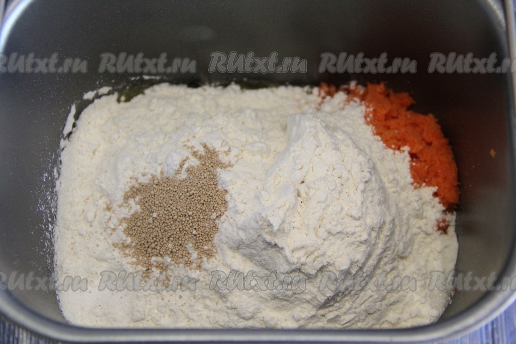 Далее всыпать муку, соль и дрожжи. Закладку продуктов выполнять в соответствии с инструкцией к вашей хлебопечки. Выставить режим "Замес теста", он занимает 1,5 часа. Для приготовления теста вручную, в тёплое молоко добавить дрожжи, перемешать и оставить до образования пышной шапки, затем соединить подошедшие дрожжи, мякоть моркови, слегка охлажденное растопленное сливочное масло, сахар, цедру, соль, яйцо, ванильный сахар, перемешать. Подсыпая в полученную массу муку, замесить мягкое тесто и оставить его в тёплом месте на 1,5 часа. Тесто должно хорошо подняться.