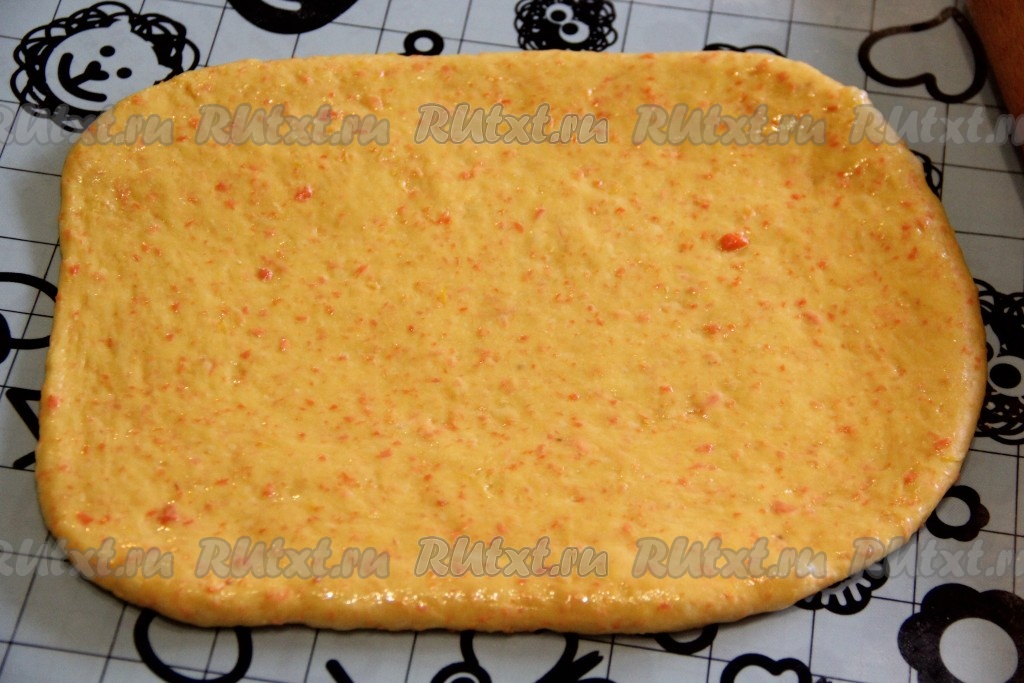Вторую часть теста раскатать в прямоугольник (не раскатывайте тонко!).