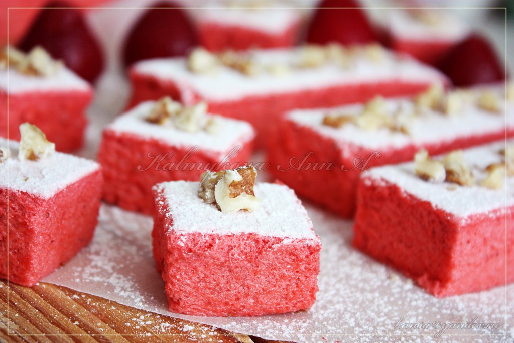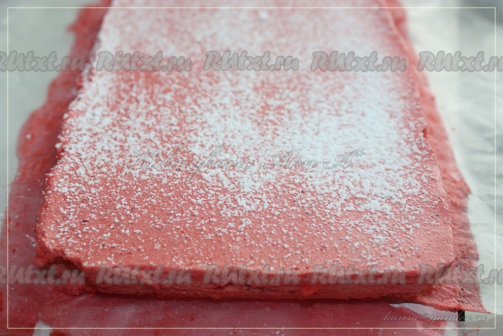 Застывшее клубничное суфле посыпать сахарной пудрой, перевернуть, аккуратно снять бумагу для выпечки (края бумаги можно поддеть с помощью ножа), ещё раз присыпать сахарной пудрой.
