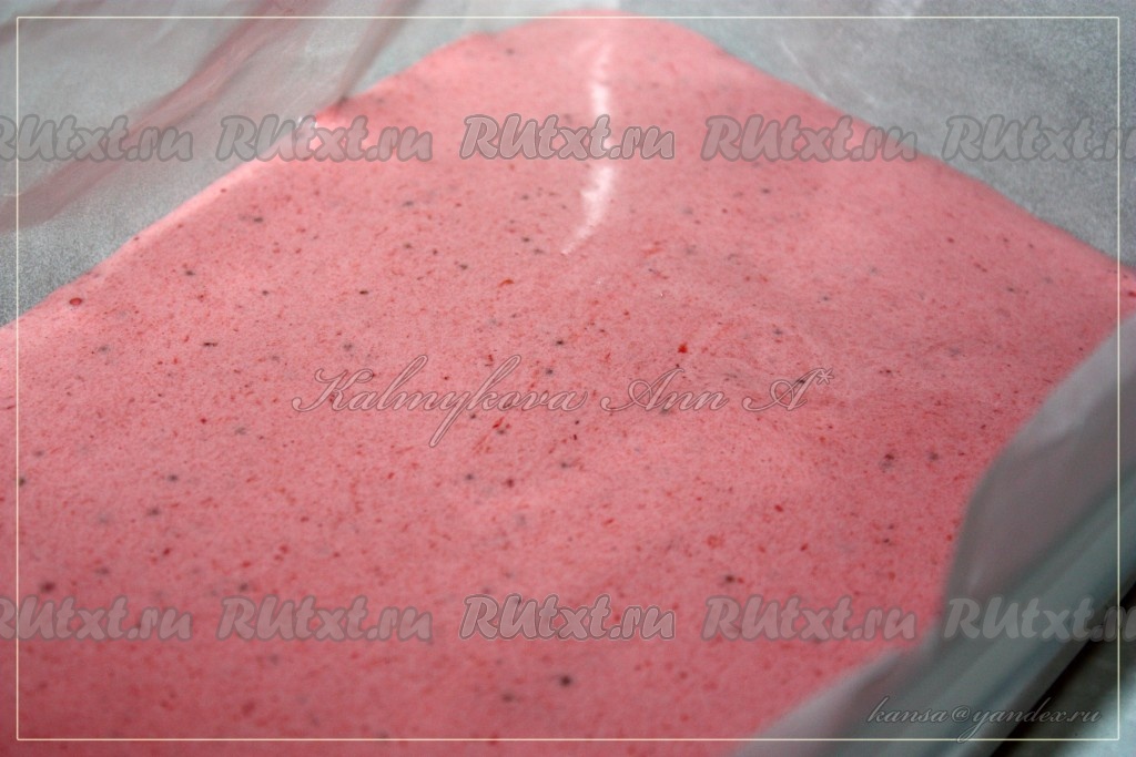 Клубничную массу выложить в форму, застеленную бумагой для выпечки, разровнять, поставить, не накрывая, в холодильник на несколько часов (до полного застывания).