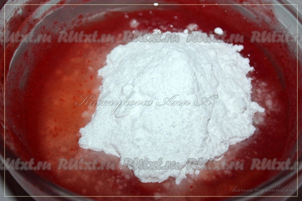 По прошествии 10-15 минут желатин набухнет. В получившуюся клубничную массу добавить 120 грамм сахарной пудры и сок, выдавленный из лимона.