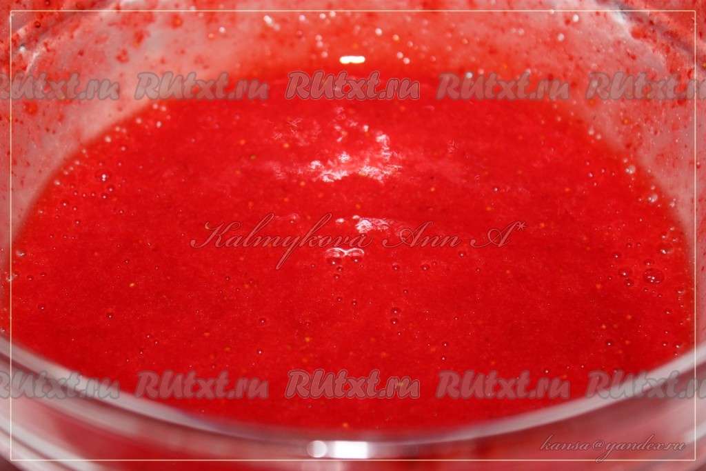 Клубнику разморозить. Ягоды вместе с соком, выделившимся в процессе размораживания, пюрировать блендером до получения однородной массы.