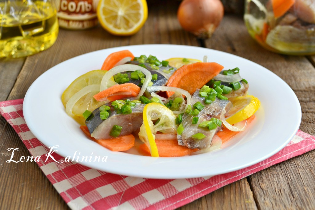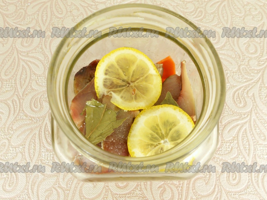 Добавить лавровый лист и пару кружочков лимона. Далее слои повторить (морковка, лук, селёдка, лимон). В один из верхних слоёв выложить второй лавровый лист. Влить растительное масло, банку закрутить (или закрыть) крышкой, немного потрясти и поместить в холодильник на сутки. Периодически банку с селёдкой нужно встряхивать.