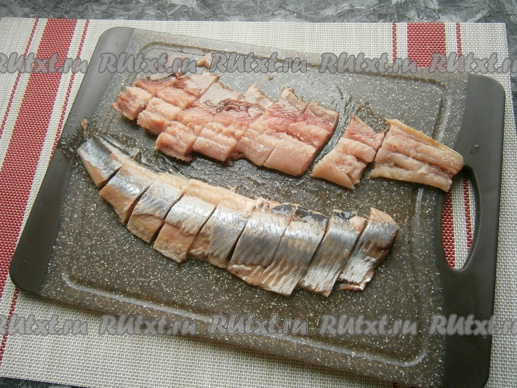 Далее выложить слой из кусочков селёдки.