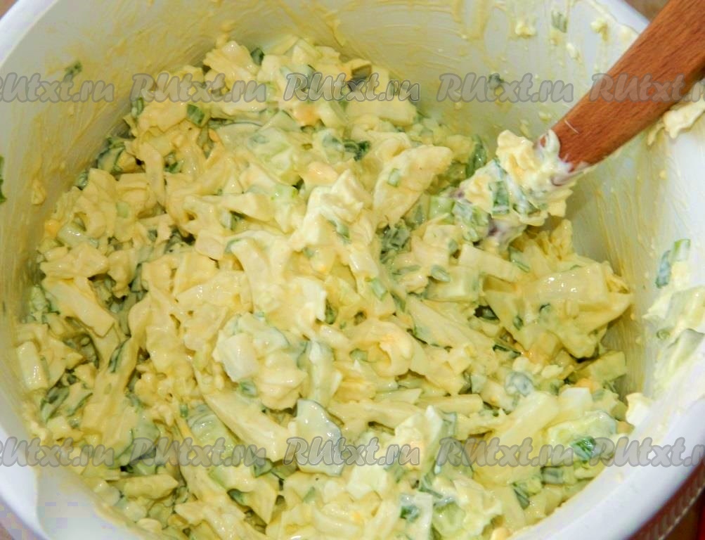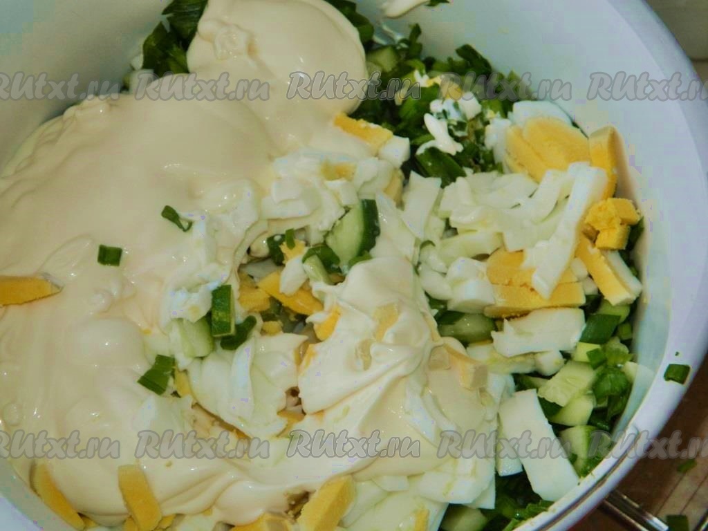 Добавляем в миску яйца, нарезанные на небольшие кусочки, и майонез, перемешиваем, подсаливаем по вкусу.
