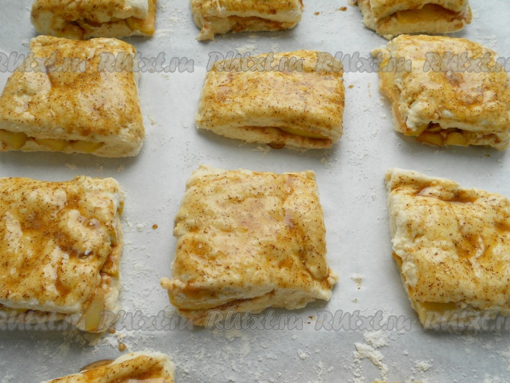 Накрыть яблоки второй частью теста и придавить края. Разрезать тесто с яблоками на 9-12 частей (квадратов), поместить их на присыпанный чуть мукой противень (я застелила пергаментом). Смазать булочки подготовленной смесью.
