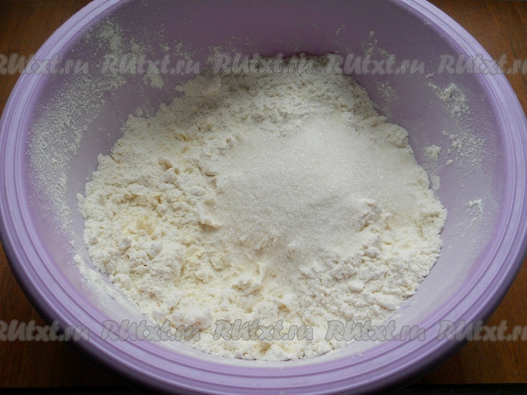 Перетереть муку с маслом в крошку, всыпать сахар.