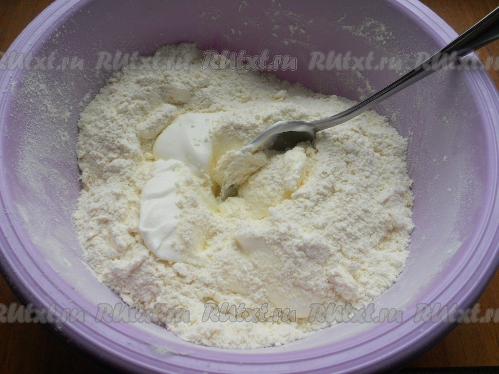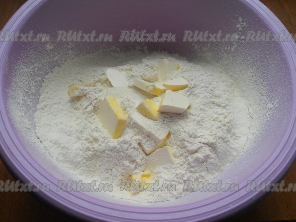 Приготовить тесто: в миску просеять муку, добавить разрыхлитель и холодное сливочное масло, нарезанное кусочками.