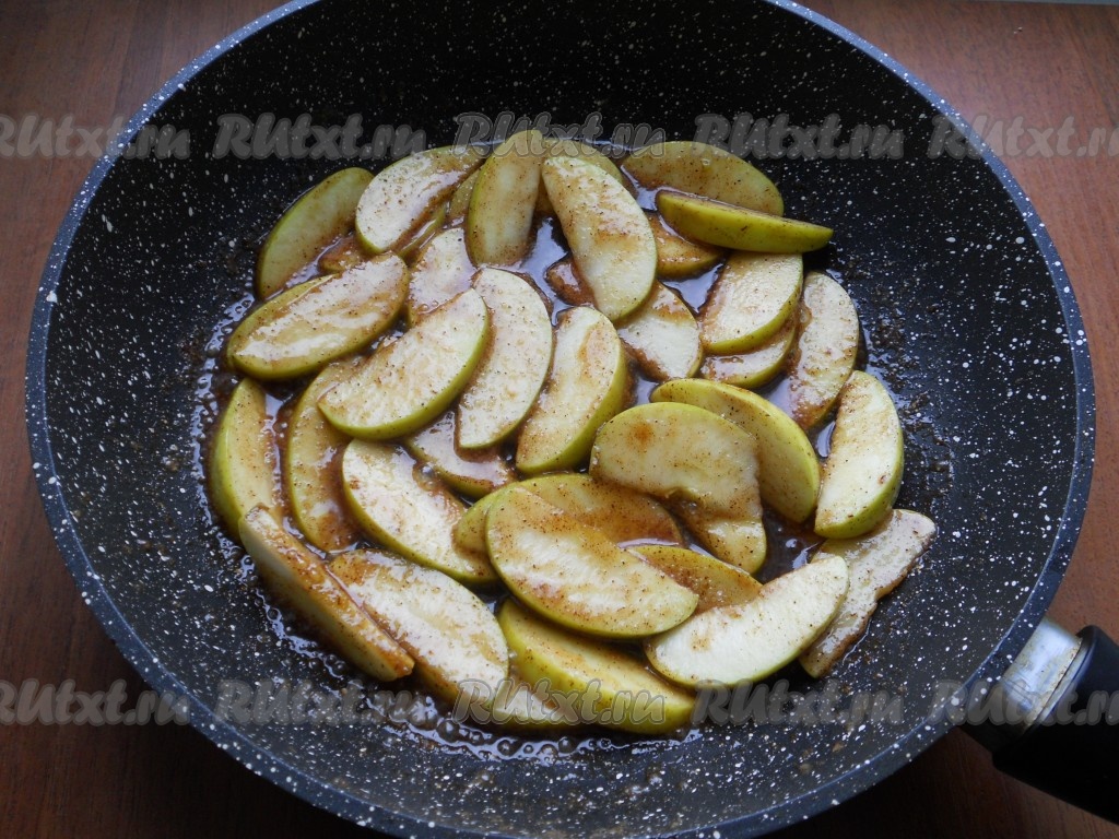 Поставить сковороду на огонь, нагреть до расплавления масла. Добавить в сковороду яблоки. Готовить яблоки на небольшом огне до растворения сахара и еще минуты 2 (всего - минут 5-6, яблоки не должны развалиться). Остудить.
