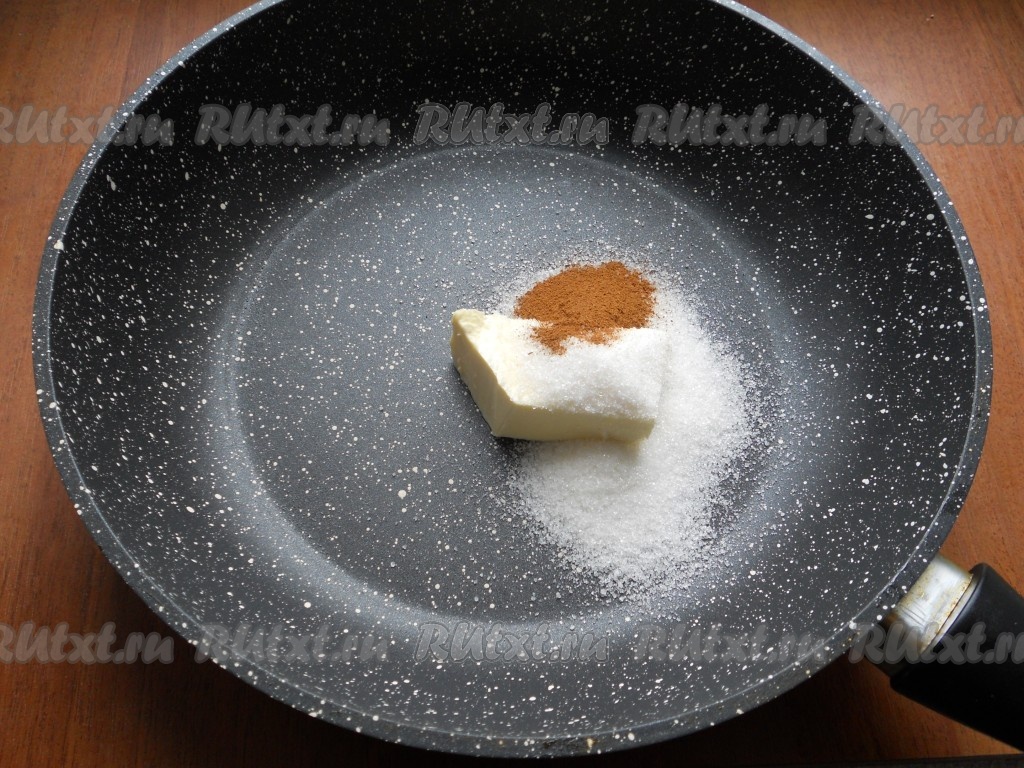 В сковороду всыпать 2 столовые ложки сахара, добавить 30 грамм сливочного масла и 1 чайную ложку корицы.