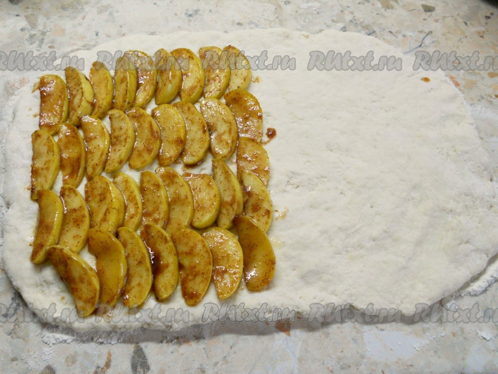 Далее на присыпанной мукой поверхности растянуть руками тесто, придав ему форму прямоугольника (тесто очень пластичное) толщиной около 1 см. На одну сторону теста выложить дольки яблок без соуса (лишняя жидкость не нужна, соус понадобится для подачи булочек).