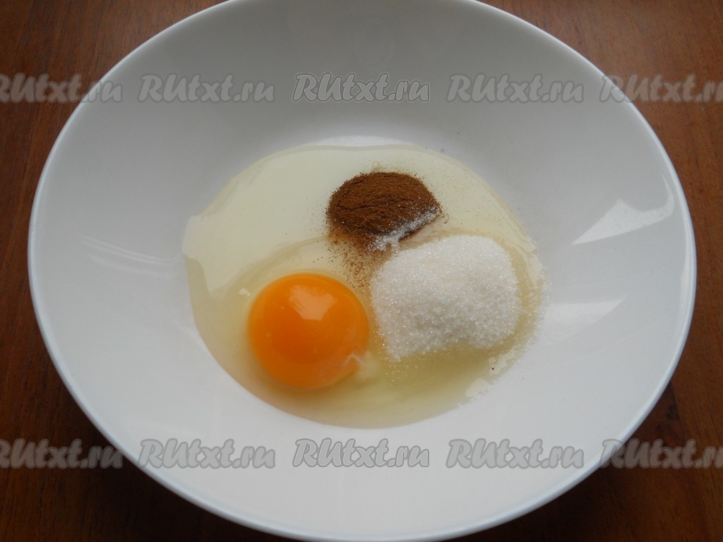 К яйцу добавить сахар и корицу, хорошо перемешать вилкой и смесь для смазывания булочек готова.