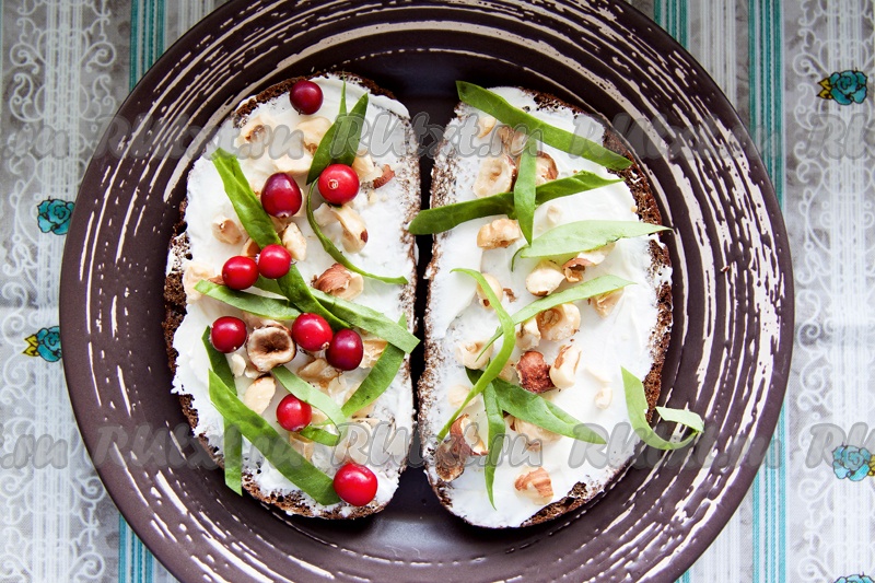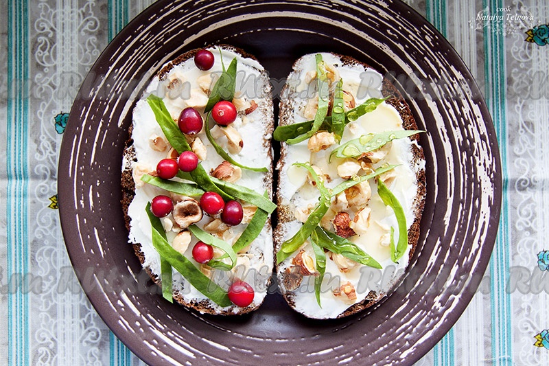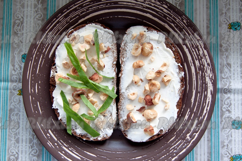 Добавьте на бутерброд дробленый фундук и тонко нарезанную зелень.