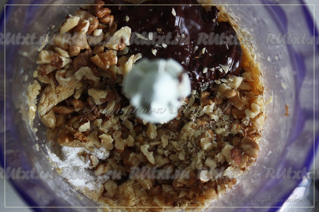 Растопить шоколад (я растопила в микроволновке) и измельчить орехи, добавить к массе.