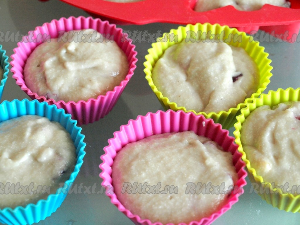 Разложить тесто по силиконовым формочкам для выпечки кексов, заполняя их на 2/3 объёма (в процессе выпечки манники хорошо поднимутся).