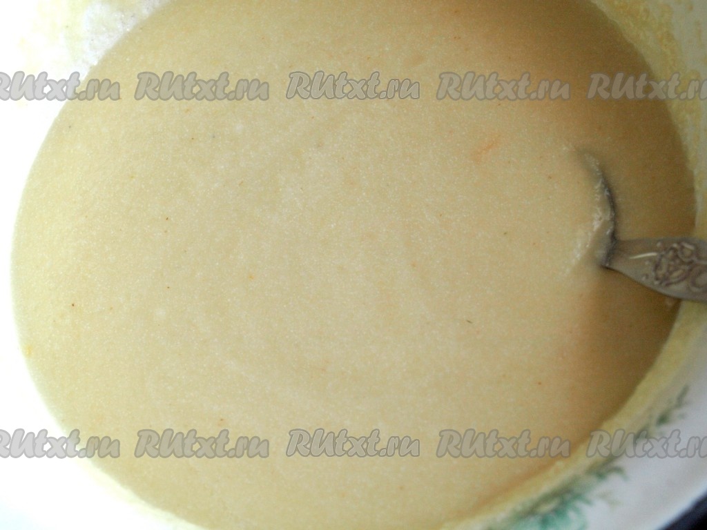 В объёмной миске соединить яйца и сахар, тщательно перемешать столовой ложкой, затем добавить кефир и манную крупу, хорошо перемешать. Оставить получившееся тесто на 30 минут, чтобы манка набухла.