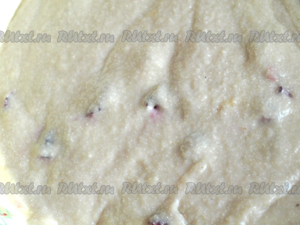По истечении времени в тесто добавить растопленное остывшее сливочное масло и соду, погашенную уксусом или лимонным соком, перемешать. Частями просеять в тесто муку, каждый раз перемешивая тесто. Итоговое тесто для мини манников должно получиться однородным, напоминающим густую сметану. При желании в тесто можно добавить вяленую вишню, изюм или другие сухофрукты.