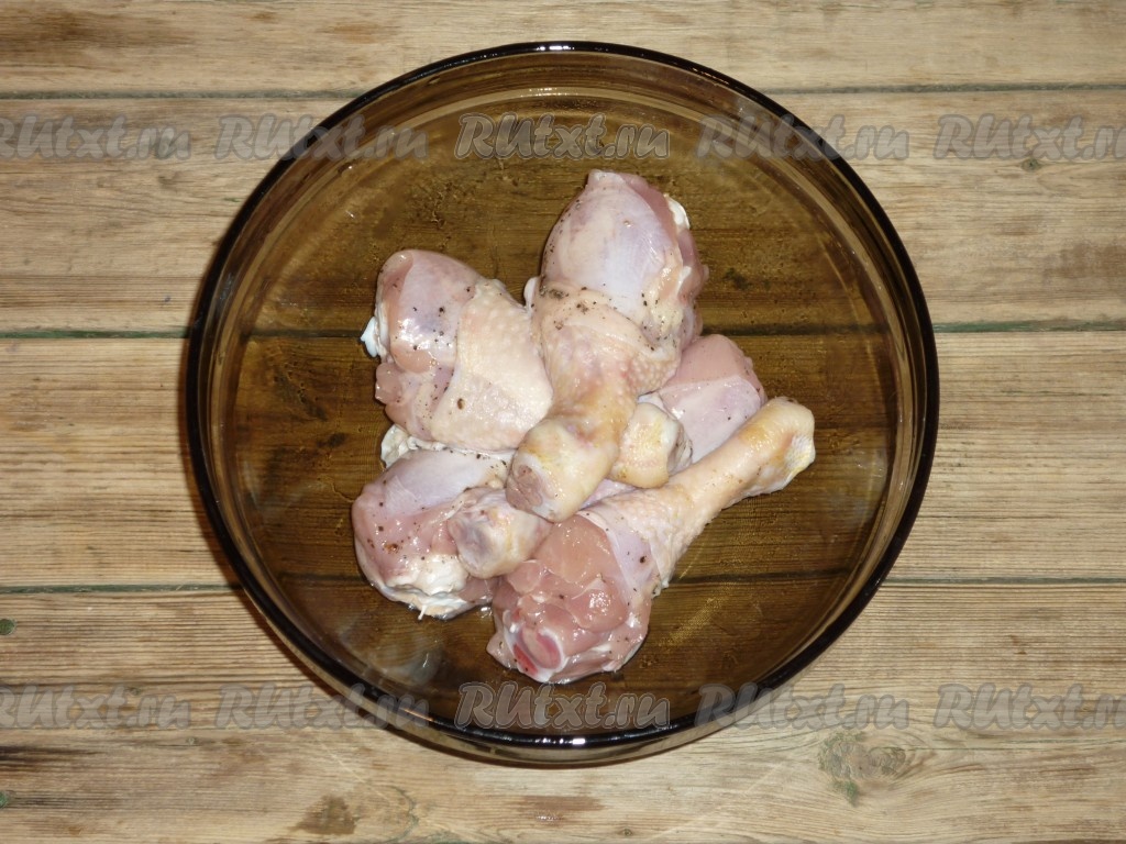 Куриные ножки вымыть, обсушить, приправить солью и перцем. Оставить на 10-15 минут.