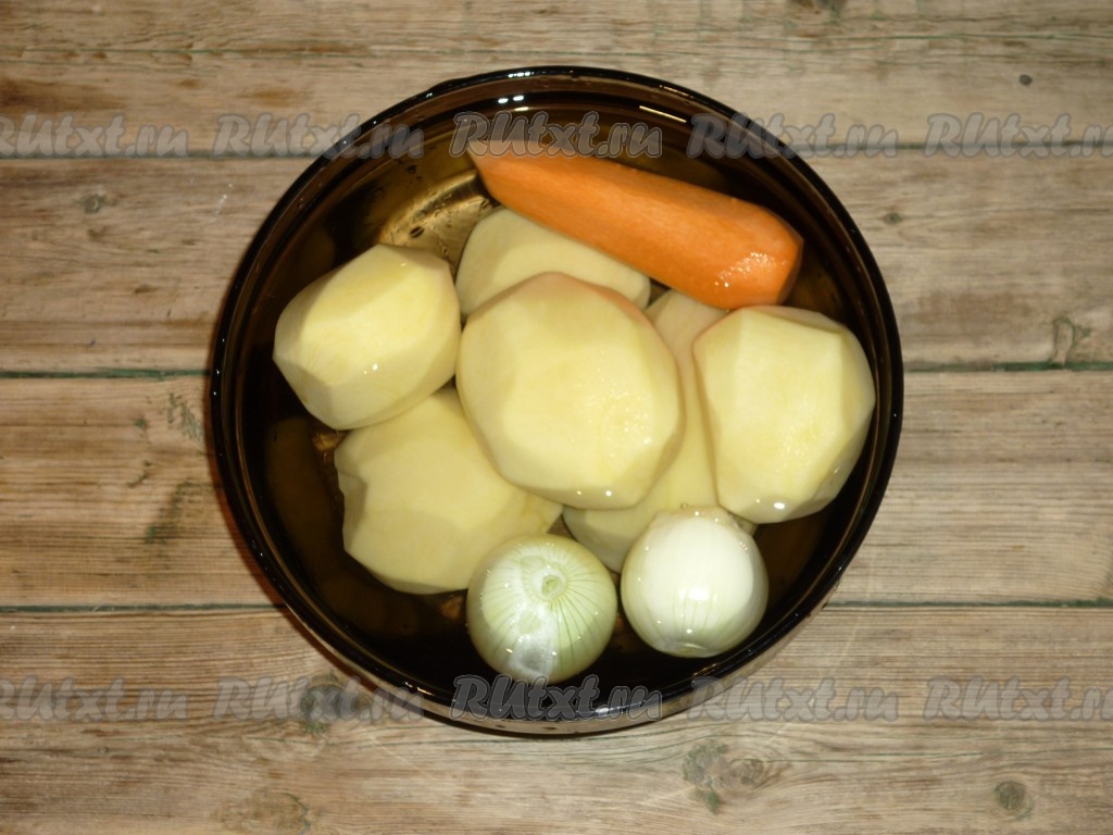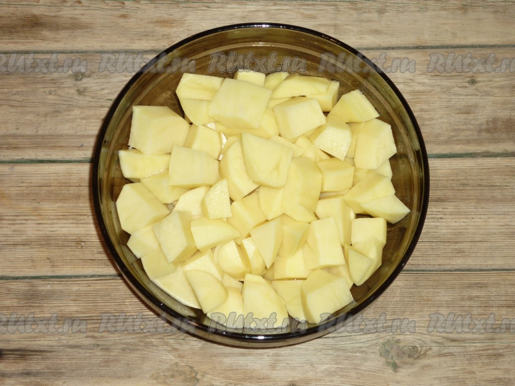 Лук и морковь тоже нарезать кубиками. Соединить картошку, морковку и лук, добавить приправу и соль по вкусу, хорошо перемешать.