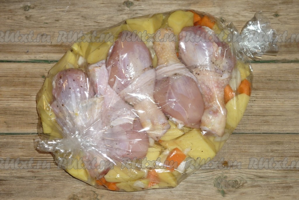 В рукав для запекания выложить сначала овощи, а сверху - куриные ножки. Завязать рукав с двух сторон. Запекать в разогретой до 200 градусов духовке 50-60 минут.