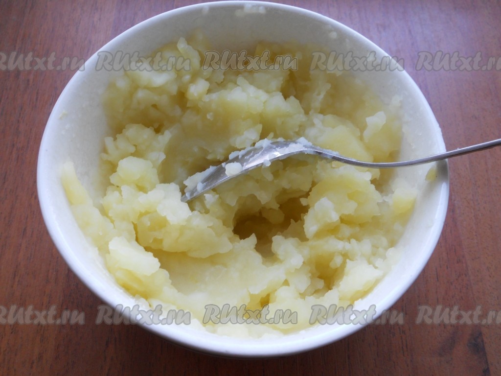Залить водой и поставить кастрюлю на огонь. Когда вода закипит, убрать пену, посолить и варить картофель до готовности (25-30 минут). Затем половину картофеля выложить в миску и размять толкушкой или ложкой.