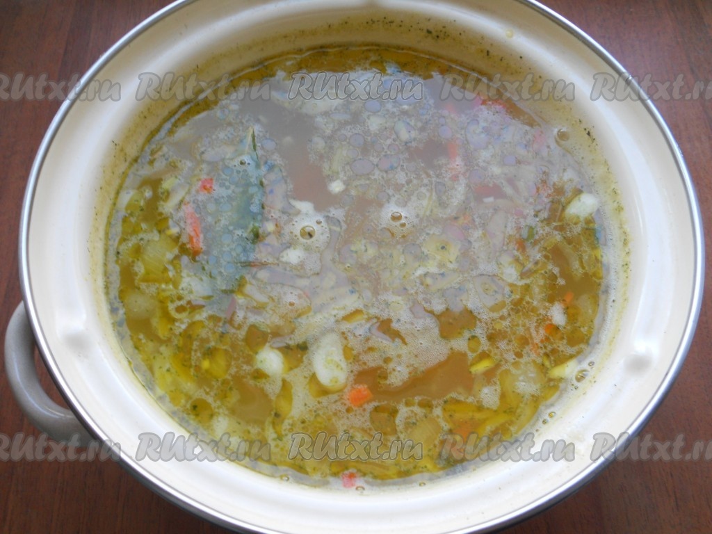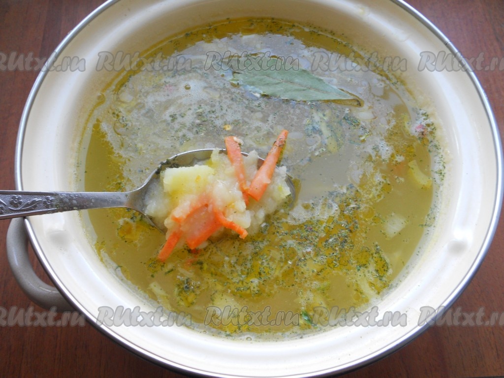 Отправить обжаренные овощи в кастрюлю с картофелем. Добавить специи, лавровый лист и приправу для супов. Кипятить суп на медленном огне минут 7.