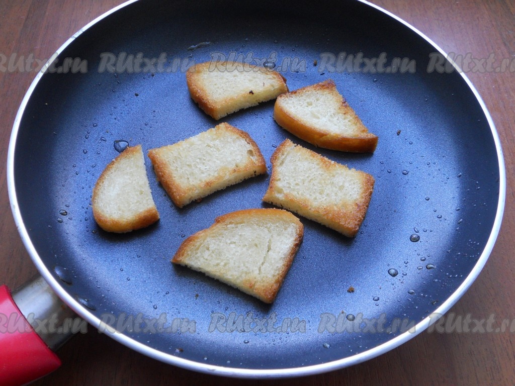 Батон белый нарезать ломтями, которые разрезать на 2-3 части. На сковороде разогреть 2-3 столовые ложки растительного масла и обжарить кусочки батона до небольшой румяности с двух сторон.