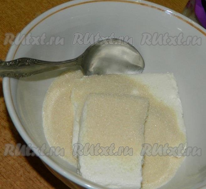Пока выпекается бисквит, приготовить творожный крем: растереть творог с сахаром, понемногу добавить сливки, до получения консистенции крема.