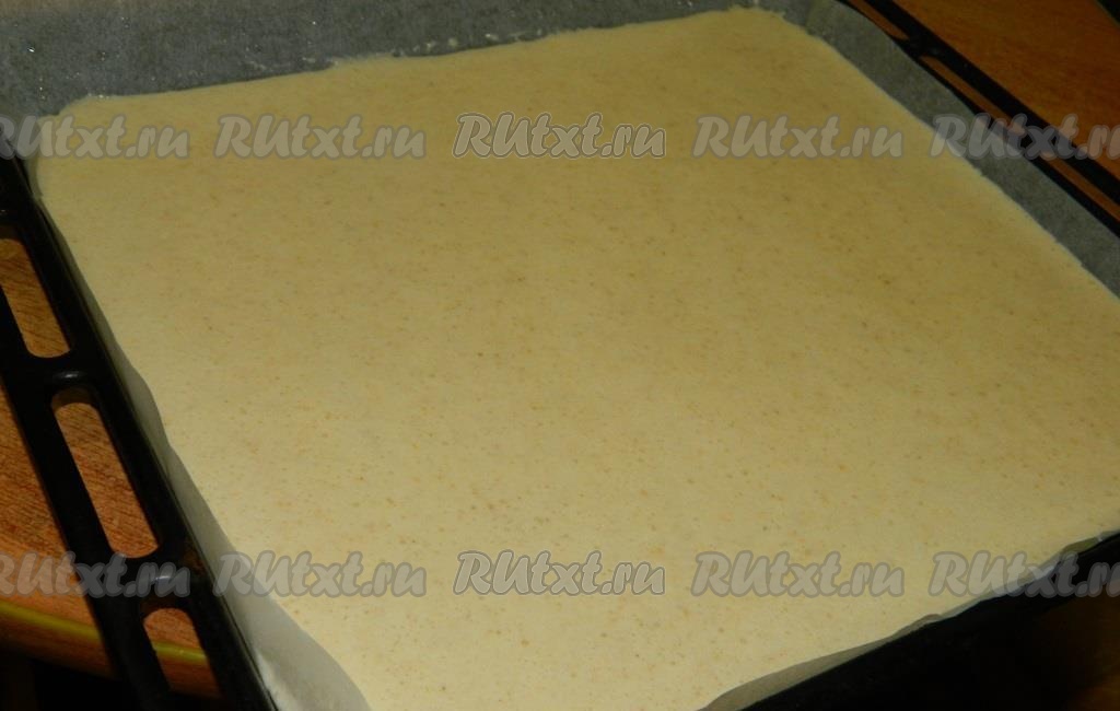 Готовый бисквит снять с противня (сильно запекать не надо), накрыть полотенцем, пусть немного остынет.