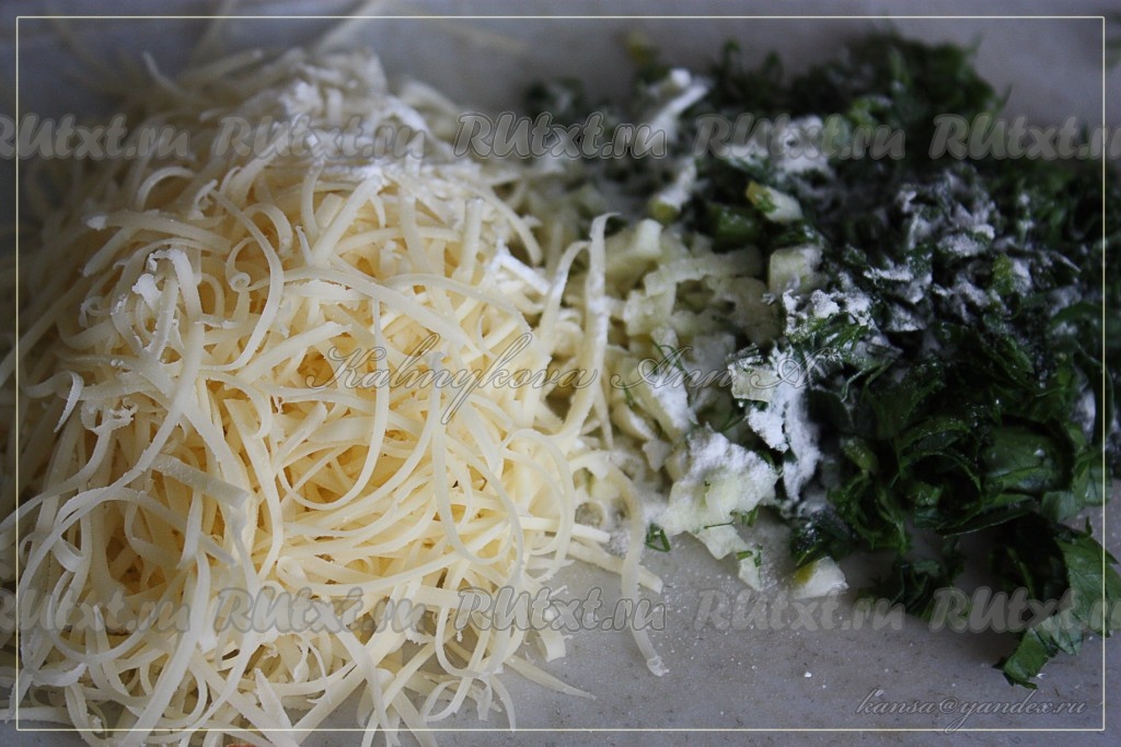 Нарезать зелень и чеснок, натереть сыр, добавить специи и разрыхлитель.