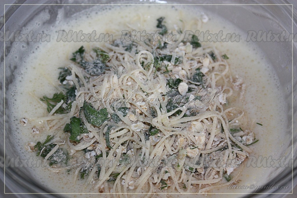 Соединить смесь сыра и зелени с мукой и овсянкой, перемешать.