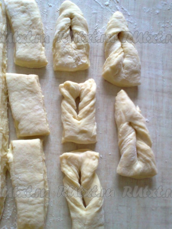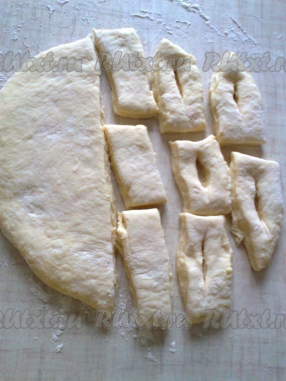 Готовое тесто раскатываем толщиной 1-1,5 см. Разрезаем на полоски. В середине прорезаем дырку.