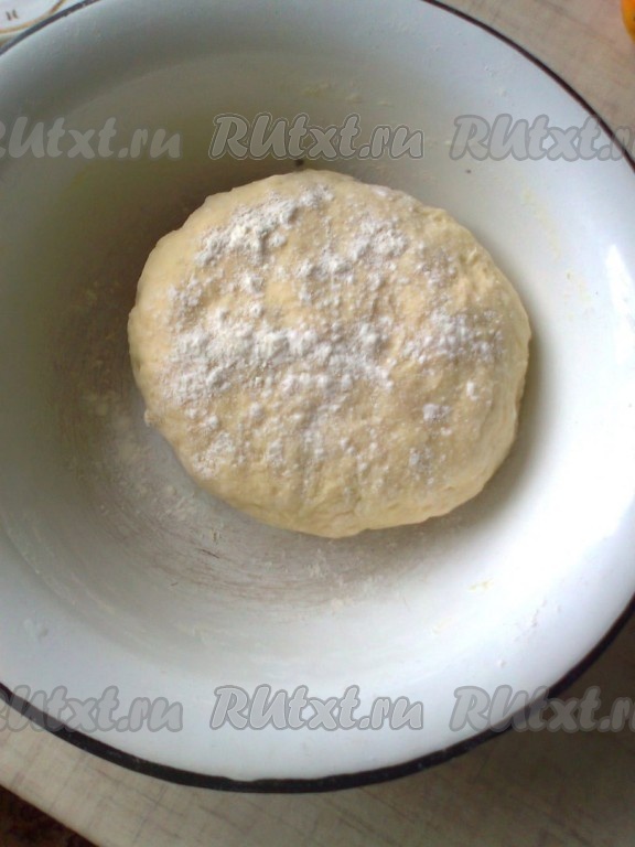 Добавляем к смеси 330 грамм просеянной муки, размешиваем ложкой. Постепенно добавляем в тесто еще муку, до тех пор, пока тесто не перестанет липнуть к рукам, но-немного, около 70 грамм (иначе тесто получится тугим, а оно должно быть очень мягким). Чем мягче получится тесто, тем воздушнее будут пышки. Собираем тесто в шар, кладем в миску, слегка посыпаем мукой, накрываем крышкой или полотенцем и оставляем на столе на 30 минут.