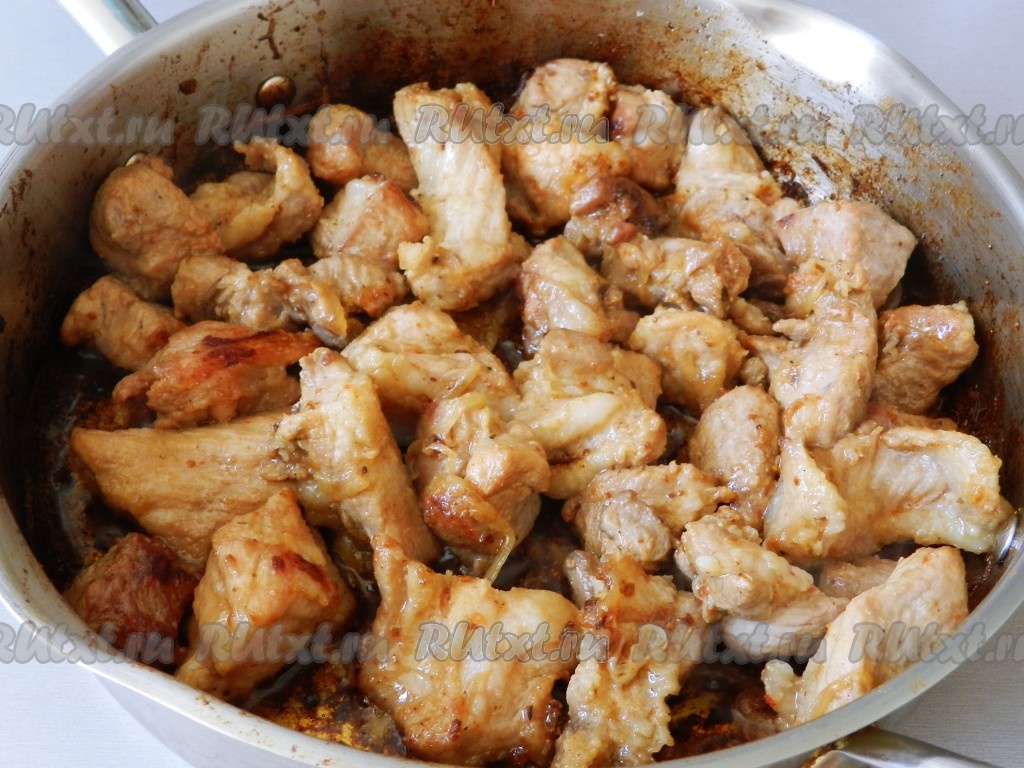 После того как мясо в процессе обжаривания изменит свой цвет, покроется золотистой корочкой, уменьшить огонь до среднего и довести свинину до готовности (в течение 15-20 минут), не забывая перемешивать, чтобы все кусочки прожарились равномерно.