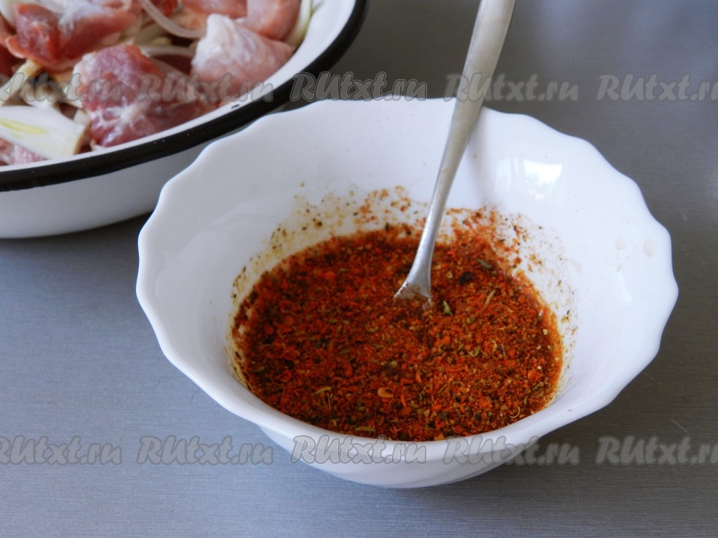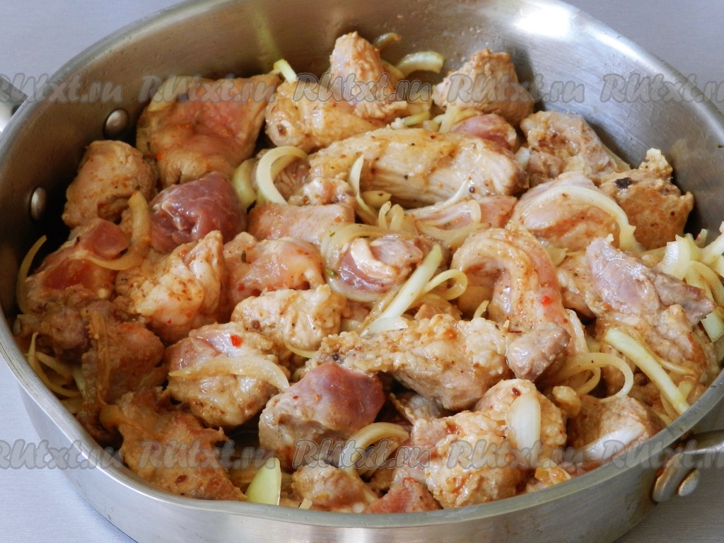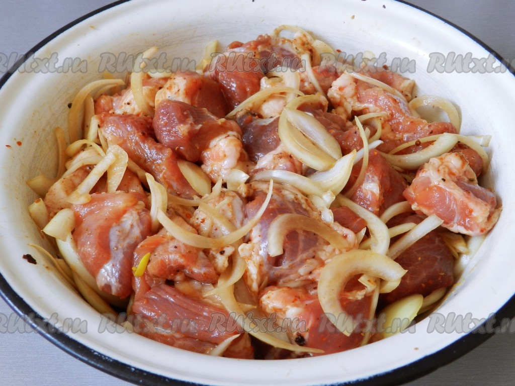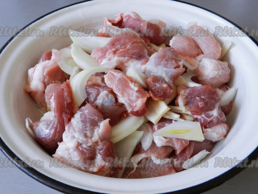 Для этого блюда лучше брать свинину с небольшим количеством жира (почечная часть, шея). Свинину вымыть, нарезать на средние кусочки. Лук очистить и нарезать полукольцами. Соединить мясо и лук в глубокой миске, перемешать.