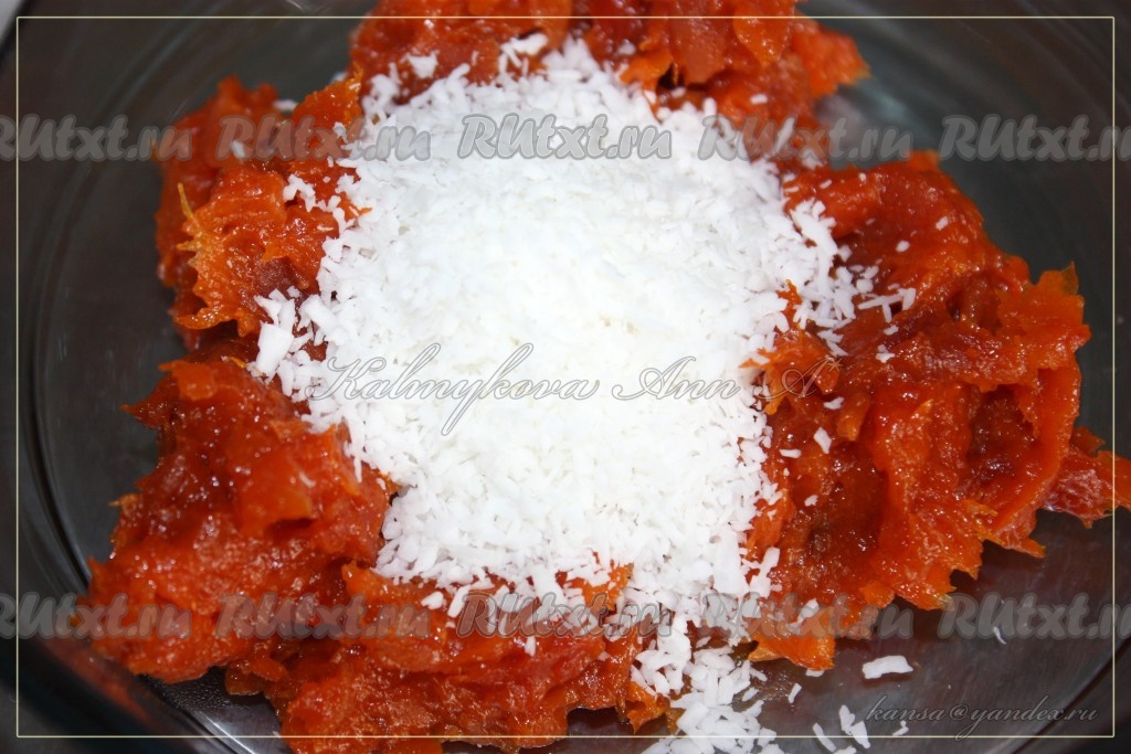 К пюрированной кураге добавить кокосовую стружку (ее может понадобиться чуть больше или меньше, в зависимости от сорта кураги и сколько воды она впитает при замачивании в кипятке), тщательно перемешать.