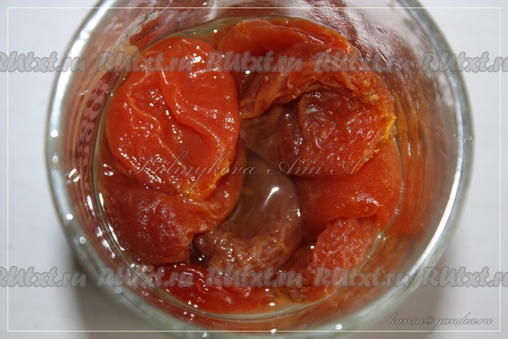 Курагу промыть и замочить в кипятке на 5 минут, затем воду слить.