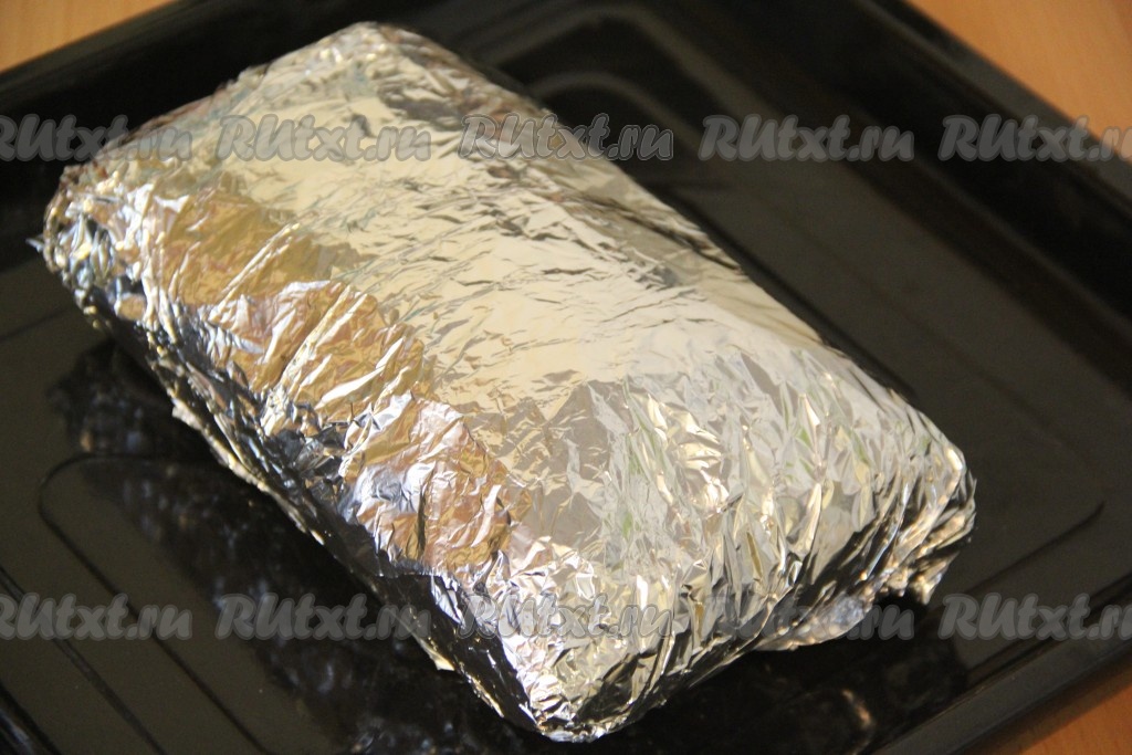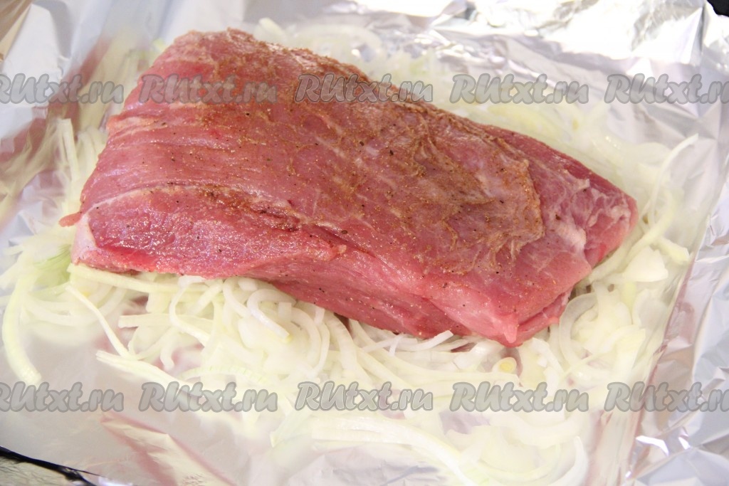 Плотно завернуть свинину с луком в фольгу. Выложить мясо на противень и в таком виде оставить промариноваться на 2 часа при комнатной температуре.