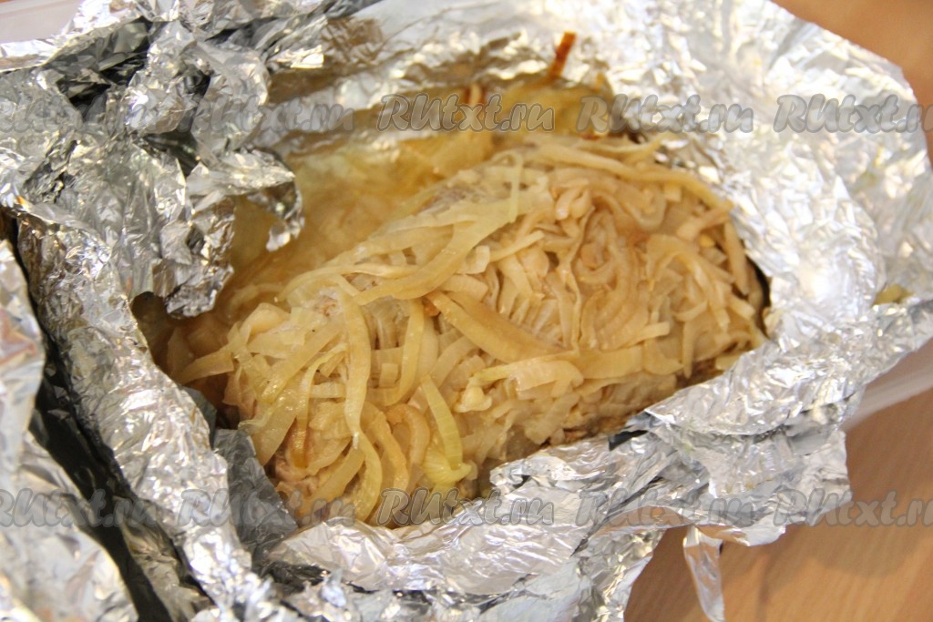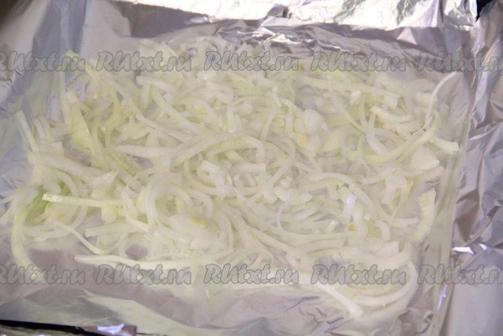 На фольгу, сложенную в два слоя, выложить часть лука.
