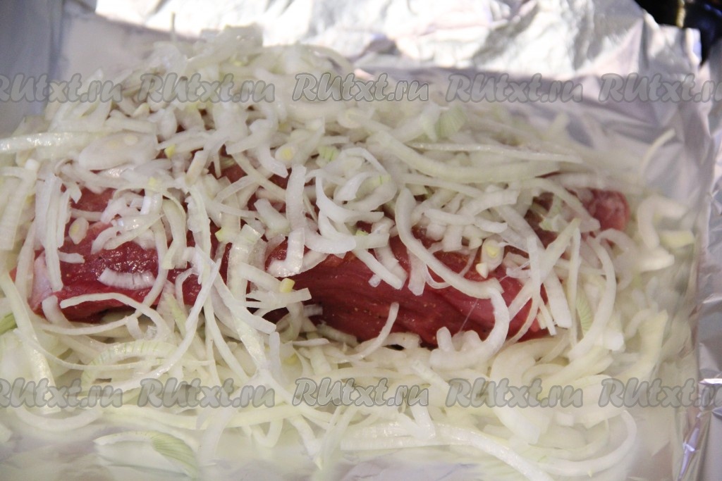 Разложить оставшийся лук поверх мяса.