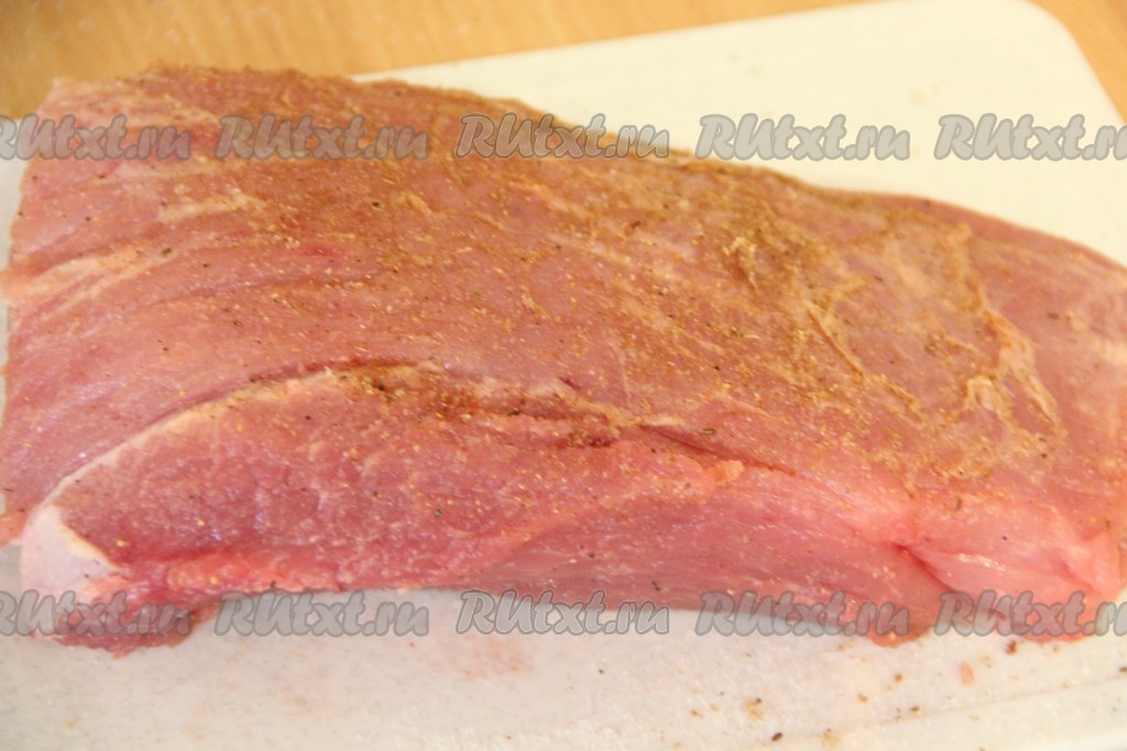 Свиной карбонад натереть со всех сторон солью и специями (я взяла смесь перцев и хмели-сунели).