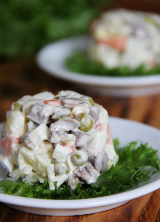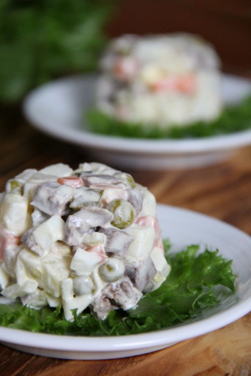 Перед подачей заправить "Оливье" майонезом. Это блюдо можно подать порционно или в большом салатнике. Вот такой вкусный и нежный салат с свиным сердцем получился.