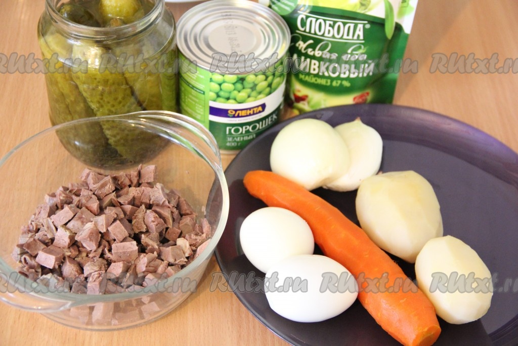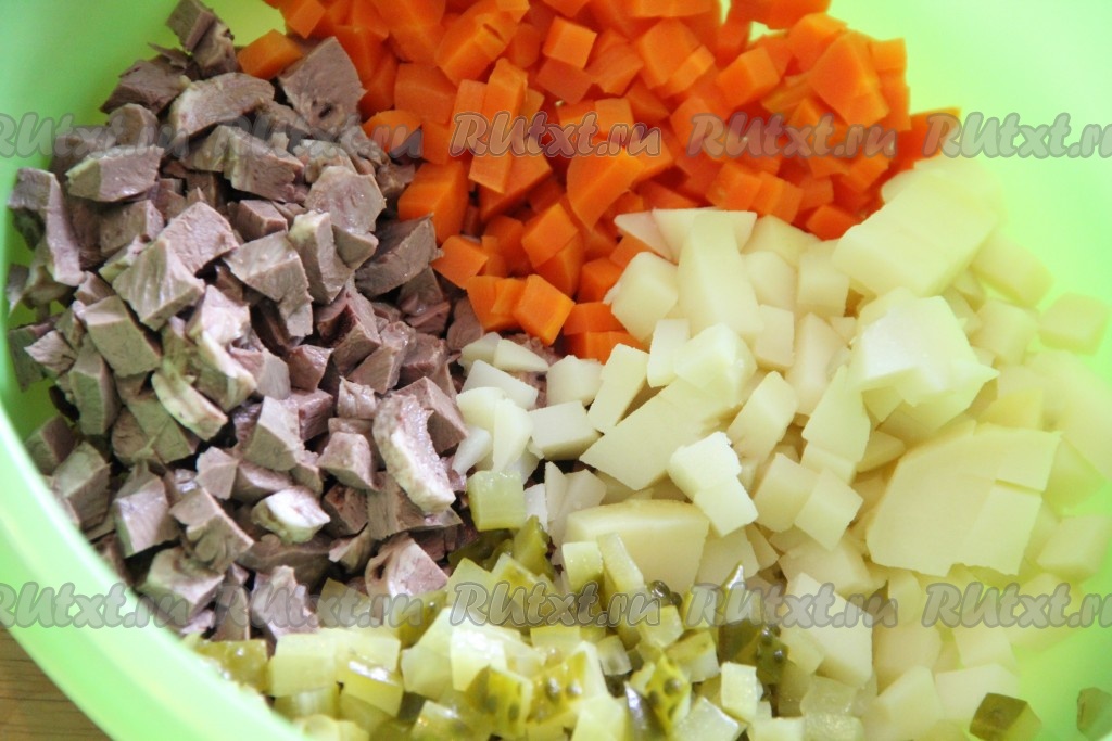 Затем остудить варёные овощи и яйца, непосредственно перед приготовлением "Оливье" очистить их. Лук очистить. Сердце достать из бульона и нарезать на кубики среднего размера.