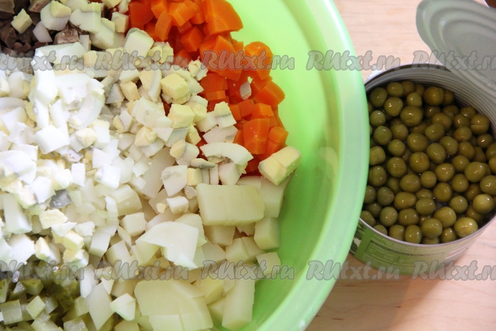 Добавить горошек в салат. Посолить по вкусу и тщательно перемешать.