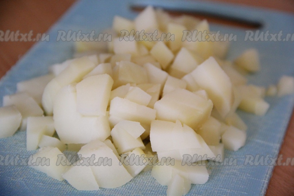 Картофель тоже нарезать на кубики среднего размера.