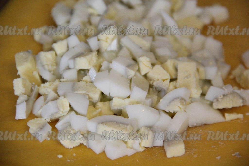 Яйца нарезать на средние кубики.