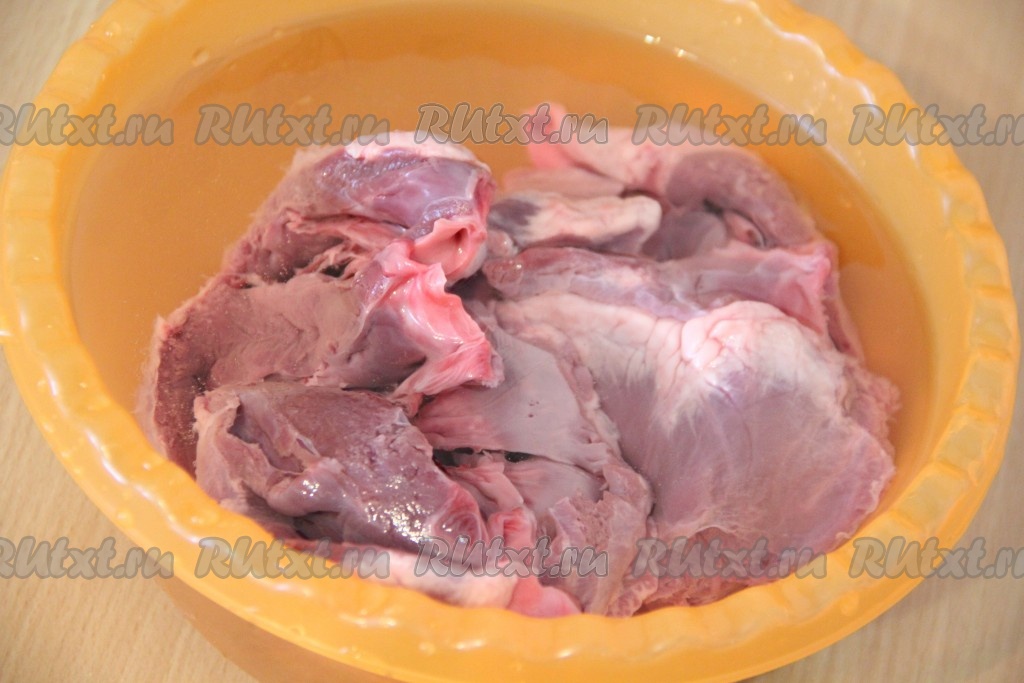 Сердце разрезать и хорошо промыть проточной холодной водой. Замочить сердце в холодной воде на 2 часа, затем воду слить.
