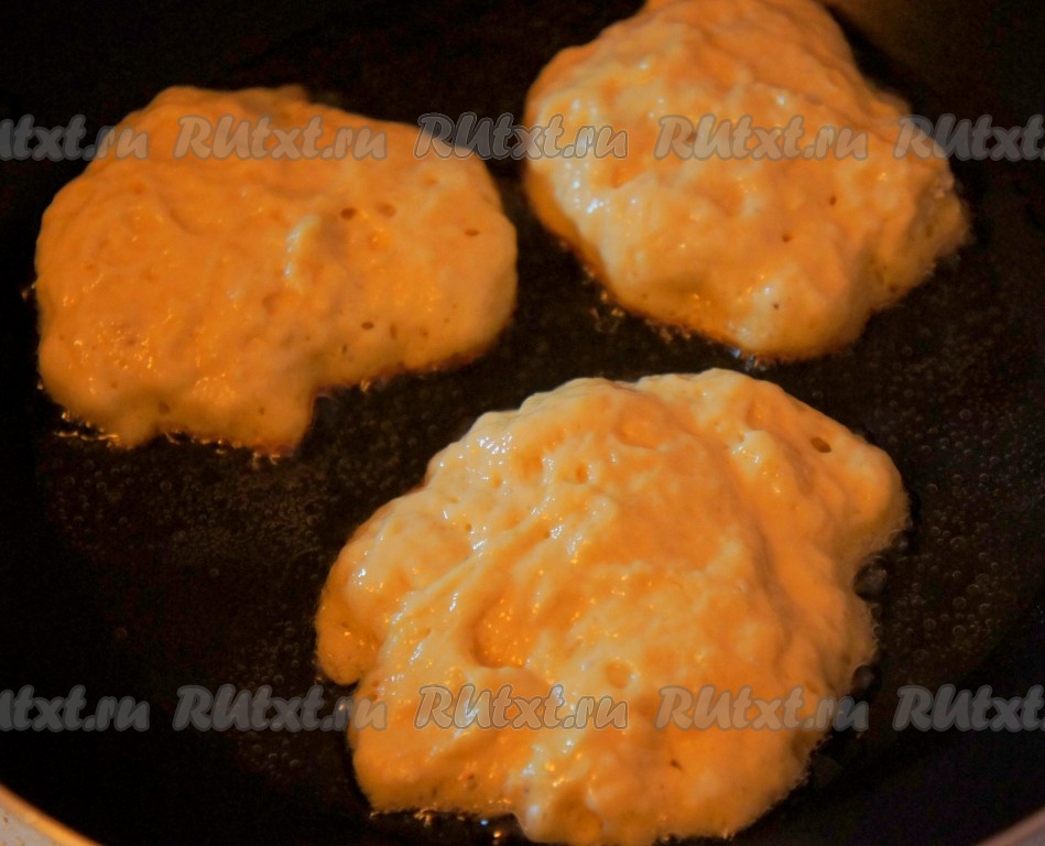 Сковороду нагреть с добавлением растительного масла. Столовую ложку смочить водой (я слегка смачиваю ложку водой каждый раз перед набором очередной порции теста). Выкладывать на сковороду по 1 столовой ложке дрожжевого теста в виде оладий. Жарить оладьи на среднем огне с двух сторон до образования румяной корочки (примерно по 2-3 минуты с каждой стороны). Оладьи в процессе жарки должны ещё подняться. Готовые оладьи переложить со сковороды на тарелку. Постепенно пожарить все дрожжевые оладушки, выкладывая тесто на сковороду столовой ложкой, смоченной в воде. Перемешивать тесто в процессе жарки не нужно.