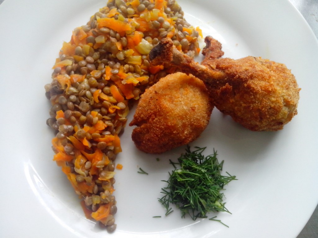 Пикантные, вкусные фаршированные куриные крылышки с гарниром из чечевицы можно подавать к столу.