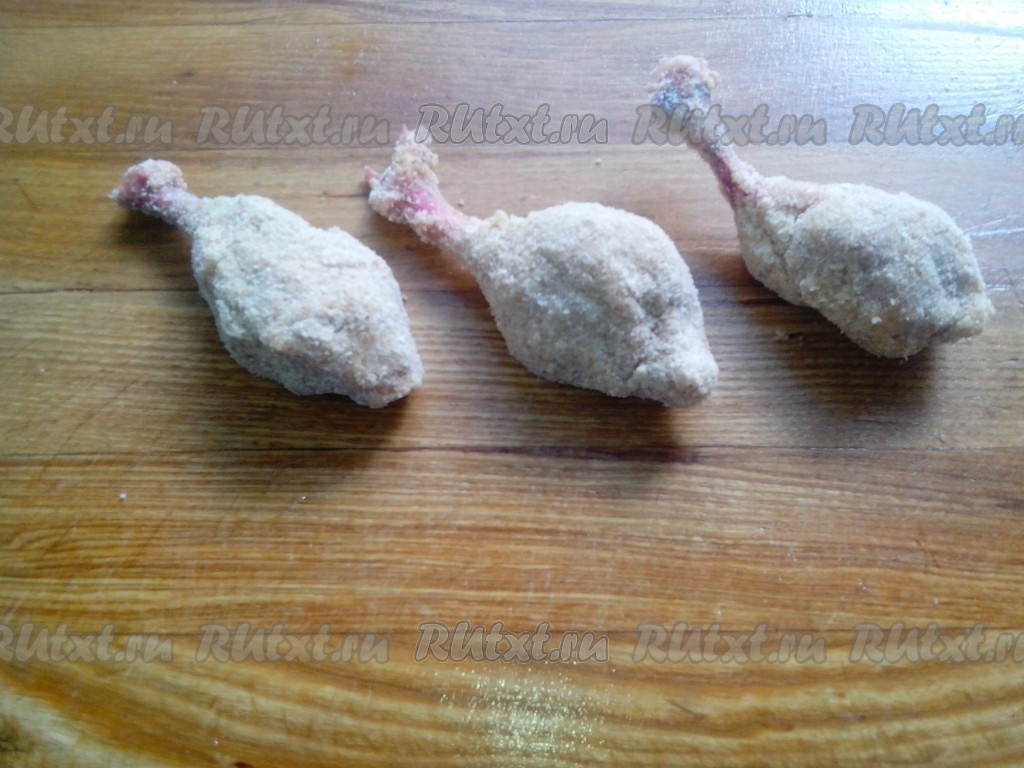 Панируем, обмакивая каждое крылышко: мука, яйцо, сухари, яйцо, сухари. И обжариваем во фритюре или, как я дома, в большом количестве масла.